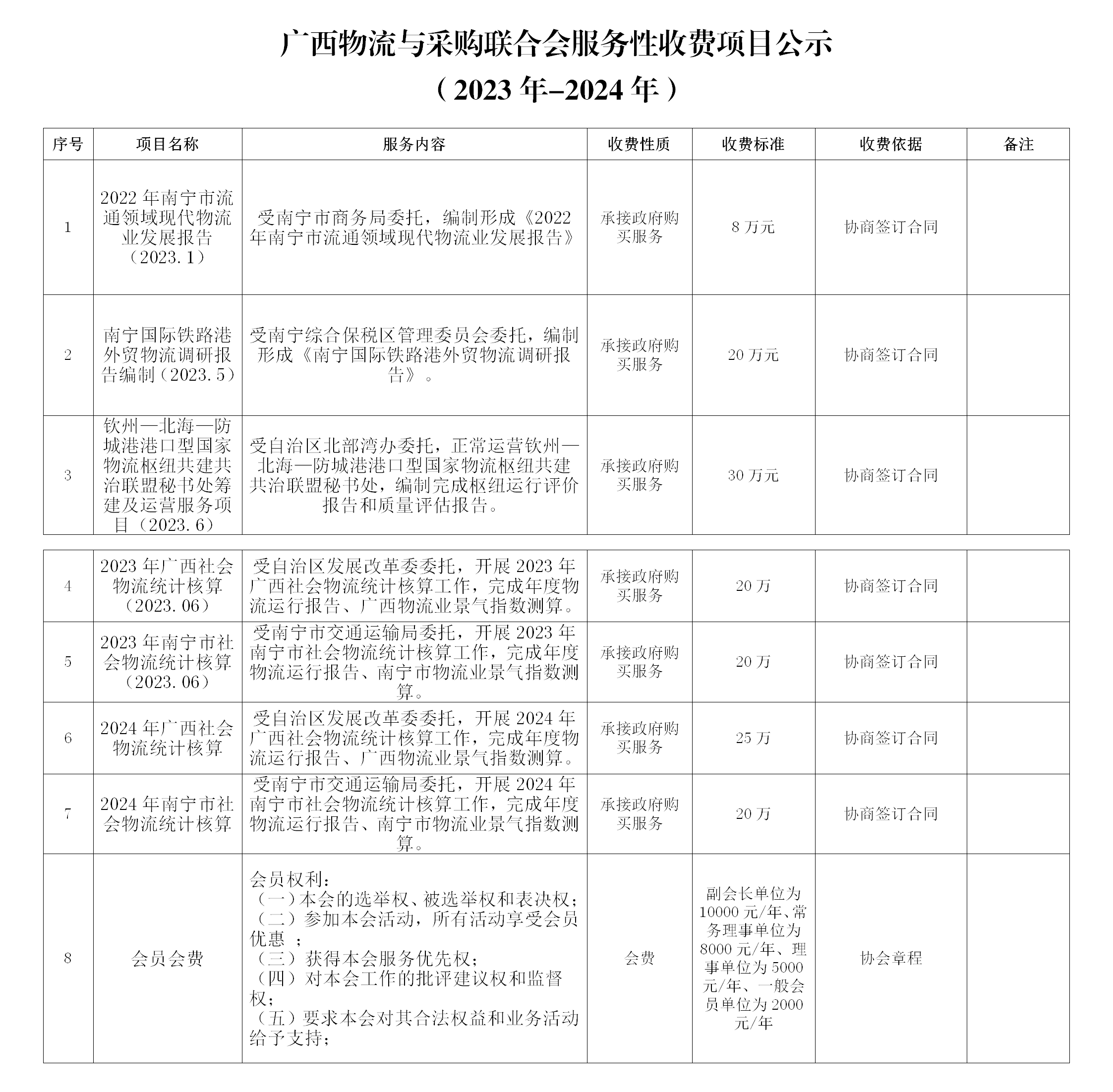 广西物流与采购联合会服务性收费项目收费公示(2023年-2024年)