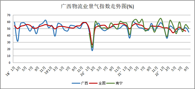 广西物流与采购联合会发布的2022年9月份广西物流业景气指数(LPI)为45%,与上月相比回落6.5个百分点。