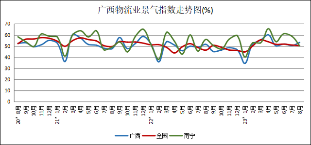 广西物流与采购联合会发布的2023年8月份广西物流业景气指数为53.2%,较上月回升2.8个百分点。