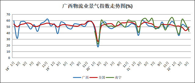 广西物流与采购联合会发布的2022年5月份广西物流业景气指数(LPI)为45.8%,与上月相比下降5个百分点。