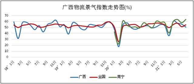 广西物流与采购联合会发布2021年6月份广西物流业景气指数(LPI)为50.7%,与5月相比下降0.7个百分点。
