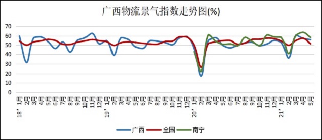 广西物流与采购联合会发布的2021年5月份广西物流业景气指数(LPI)为51.4%,与4月相比下降5.8个百分点,属于季节性、周期性小幅回落。
