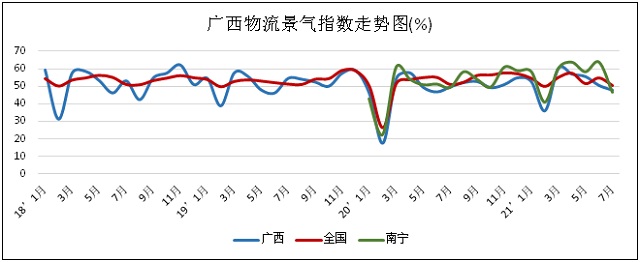 广西物流与采购联合会发布的2021年7月份广西物流业景气指数(LPI)为48.0%,与去年同期相比基本持平。