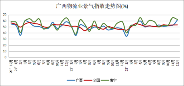 广西物流与采购联合会发布的2023年12月份广西物流业景气指数为61.6%,较上月回升8.7个百分点。