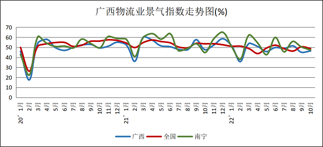 广西物流与采购联合会发布的2022年10月份广西物流业景气指数(LPI)为46.4%,与上月相比上升1.4个百分点。