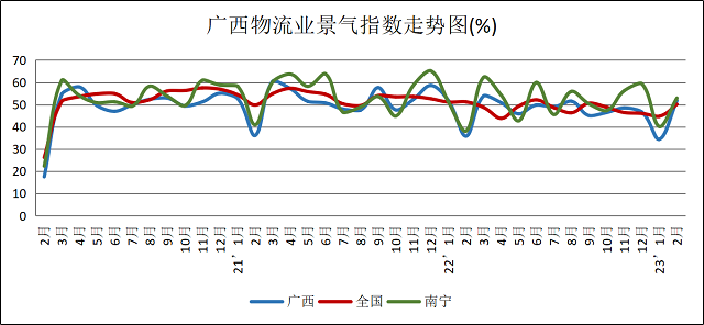 广西物流与采购联合会发布的2023年2月份广西物流业景气指数(LPI)为51.8%,较上月回升17.4个百分点。