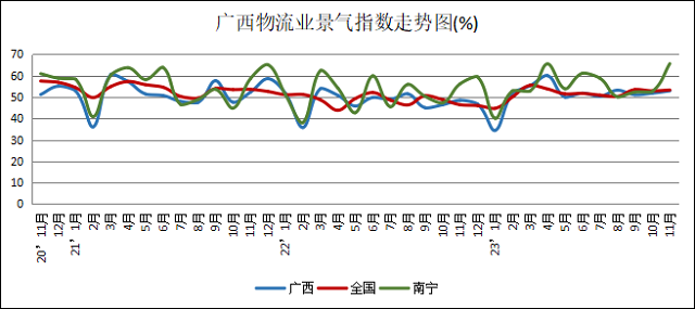 广西物流与采购联合会发布的2023年11月份广西物流业景气指数为52.9%,较上月回升1.1个百分点。