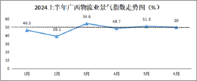 广西物流与采购联合会发布的2024年6月份广西物流业景气指数为50.0%,较上月回落1.3个百分点。