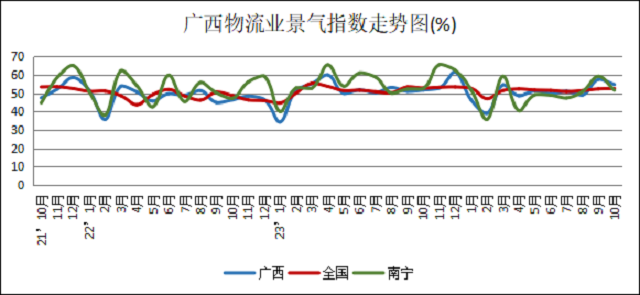 企业经营相关指数保持在景气区间运行,经营效益趋稳。10月份,广西物流业服务价格指数为53.6%,主营业务成本指数为54.8%,主营业务利润指数为52.4%,下降3.7个百分点。9月份以来,随着一揽子增量政策加快推出,市场活力增强,企业微观活力和经营效益趋稳。