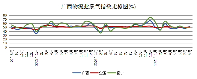 广西物流与采购联合会发布的2025年8月份广西物流业景气指数(LPI)为52.3%,较上月回升5个百分点。