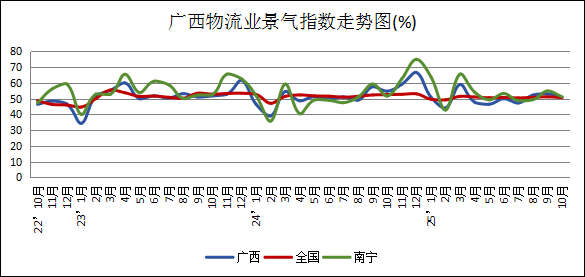 10月份,广西物流业景气指数略微回落,但仍保持扩张态势,与全国走势一致。从分项指数看,十二项指数中有九项处于扩张区间,资金周转率指数、物流服务价格指数以及主营业务利润指数低于50%荣枯线运行。行业运行呈现内外需求双轮驱动格局,内部消费市场活力持续释放,外部跨境物流通道运行畅通,与东盟互联互通成效显著。