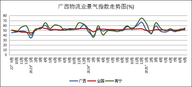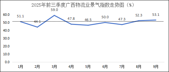 广西物流与采购联合会发布的2025年9月份广西物流业景气指数(LPI)为53.1%,较上月回升0.8个百分点。