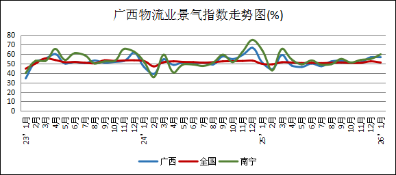 1月份,在春节前夕居民消费需求集中释放与企业供应链前置备货的双重驱动下,广西物流行业整体呈现节前平稳扩张特征,物流活动保持较高活跃度,业务规模稳中有升,有效支撑了节日市场供应与产业链顺畅运转,为全年物流业高质量发展实现良好开局。