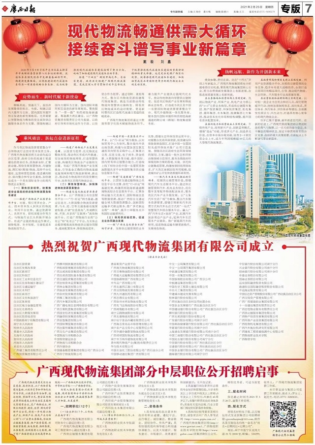 恰逢“十四五”规划开局之年,自治区党委、政府决定组建广西现代物流集团,是我区深入学习贯彻习近平总书记关于统筹推进现代流通体系建设的重要讲话精神的重大举措,也是充分发挥广西区位优势,统筹推进现代流通体系建设,加快培育我区具有国际竞争力的现代物流企业的生动实践。