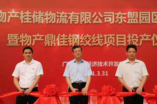 3月31日上午,广西物产桂储物流有限公司东盟园区一期开业暨物产鼎佳钢绞线项目投产仪式在广西-东盟经济技术开发区顺利举行。广西现代物流集团党委书记、董事长戴毅,广西-东盟经济技术开发区管委会副主任韦耿出席仪式。