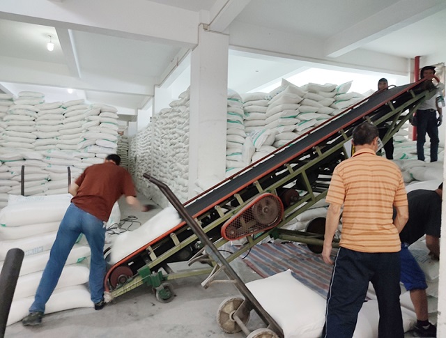 在贵港桂糖公司食糖收储作业现场,工作人员正干得热火朝天,节后的收储生产线全面铺开,公司库区内一片忙碌,截至目前,贵港桂糖公司已完成7万吨食糖入库,实现7.5万吨满库目标任务指日可待。