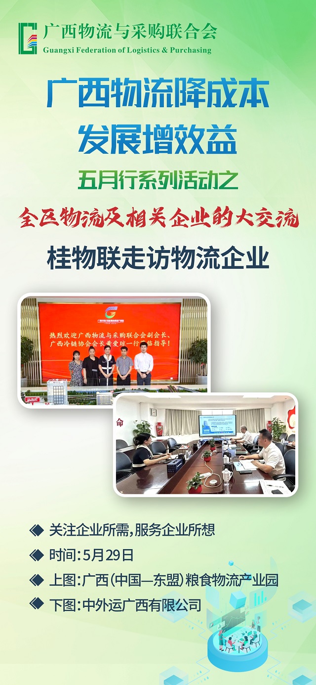 5月29日,广西物流与采购联合会副会长黄爱琼一行到广西(中国—东盟)粮食物流产业园、中外运广西有限公司进行走访调研,并分别与广西粮食物流产业园区有限公司董事长卢招彩、中外运广西有限公司总经理吴杰进行座谈交流。