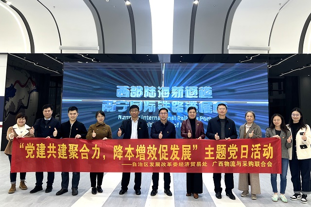 3月14日,自治区发展改革委经贸处与广西物流与采购联合会联合开展“党建共建聚合力,降本增效促发展”主题党日活动,双方党支部组成调研组深入南宁陆港型国家物流枢纽——南宁国际铁路港和南宁农产品交易中心,开展主题党日活动和专题调研,并就降低全社会物流成本与广西重点物流企业开展座谈交流,听取企业意见建议。自治区发展改革委经贸处处长、党支部书记薛贻德主持座谈会。自治区发展改革委经贸处副处长崔永锋,广西物流与采购联合会党支部书记、副会长黄爱琼,秘书长邓晓滨一同参加。