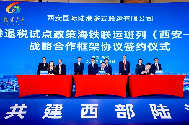推介会现场,举行了陆路启运港退税试点政策海铁联运班列(西安—北部湾港)战略合作框架协议签订仪式,宣布了西部陆海新通道(西安—北部湾港)海铁联运班列常态化开行,随着陕桂海铁联运班列常态化开行与陆路启运港退税试点政策的叠加,将为陕西省及周边的企业提供一条稳定、安全、高效、便捷的物流运输大通道。