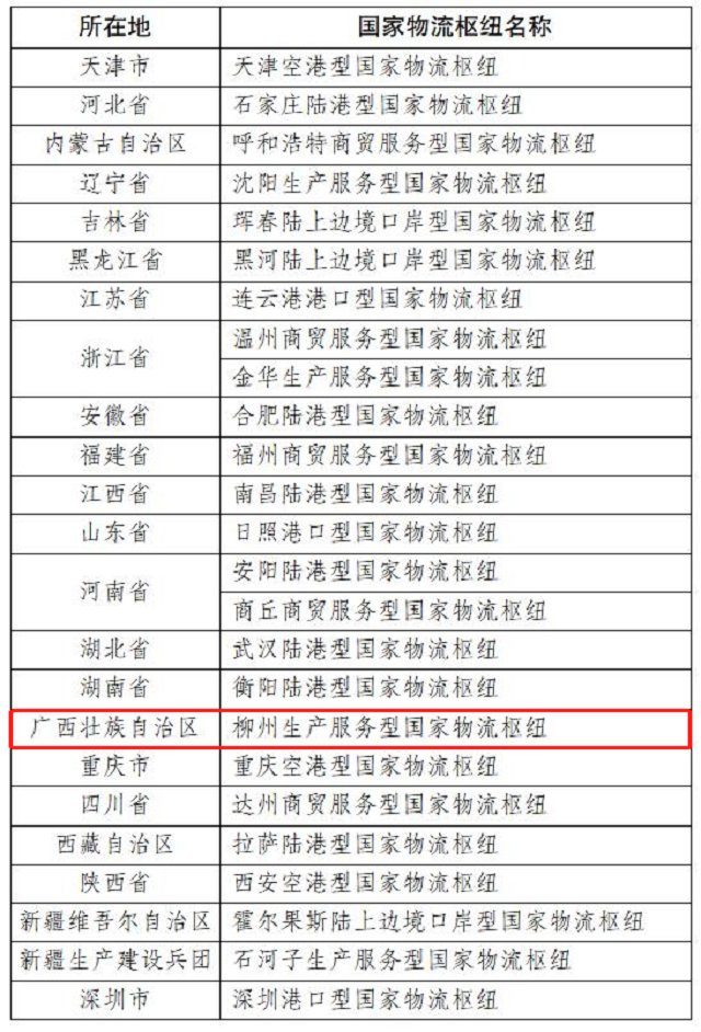 根据11月29日国家发展改革委印发《关于做好“十四五”首批国家物流枢纽建设工作的通知》(发改经贸﹝2021﹞1697号),公布柳州生产服务型国家物流枢纽成功入选“十四五”首批国家物流枢纽建设名单,是广西第3个成功入选的枢纽,也是广西唯一一个生产服务型国家物流枢纽。