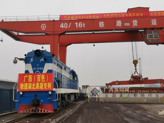 2月11日上午,广西支援湖北果蔬物资直达冷链专列从百色火车东站启程,直发湖北宜昌市。这是继2月7日广西开行第三班支援湖北果蔬物资直达冷链专列后,时隔4天开行的第四班专列。
