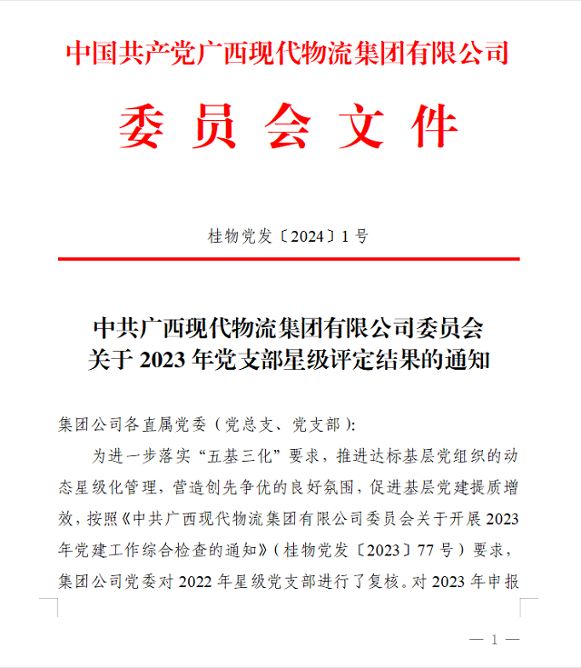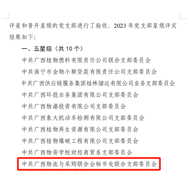 广西现代物流集团党委近日公布2023年党支部星级评定结果,广西物流与采购联合会秘书处联合党支部获评为“五星级党支部”。