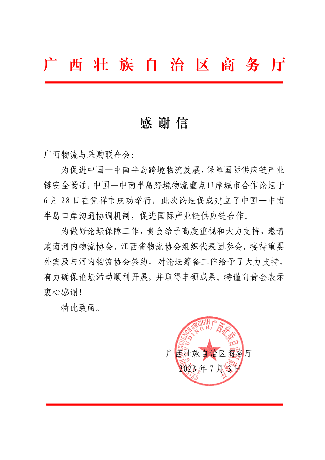 近日,广西壮族自治区商务厅向广西物流与采购联合会发来感谢信,对桂物联大力支持中国—中南半岛跨境物流重点口岸城市合作论坛筹备工作并取得丰硕成果表示感谢。