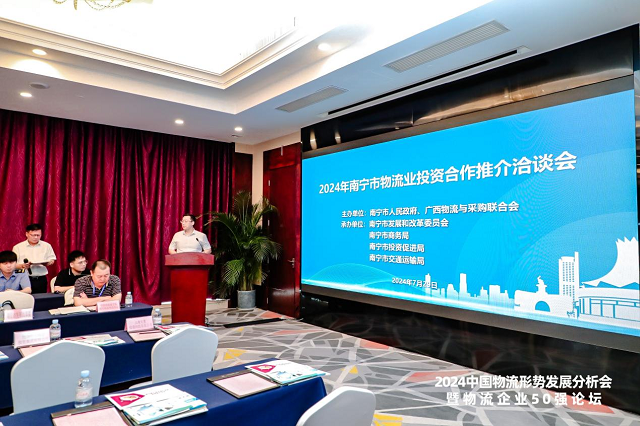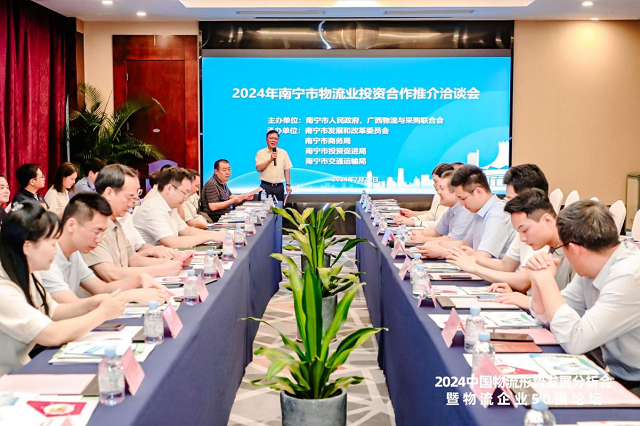 会议前,7月29日下午,南宁市人民政府与广西物流与采购联合会联合举办“2024年南宁市物流业投资合作推介洽谈会”,何辉、刘宇航、陈中涛、中非共和国驻华大使馆参赞农函颖、南宁市发展改革委主任兰捷、南宁市发展改革委副主任赖承略以及南宁市各城区政府、重点物流企业等代表出席会议。会议邀请阿里巴巴菜鸟集团、京东物流集团、中铁铁龙集装箱物流股份有限公司、极兔速递有限公司、深圳市跨越速运有限公司、山东高速物流集团有限公司等16家国内龙头物流企业。会上,五象新区管委会,横州市人民政府、江南区人民政府,广西机场管理集团有限责任公司、中国铁路南宁局集团有限公司、南宁交投集团、南宁乡村振兴集团等分别就本单位招商合作需求等进行推介。