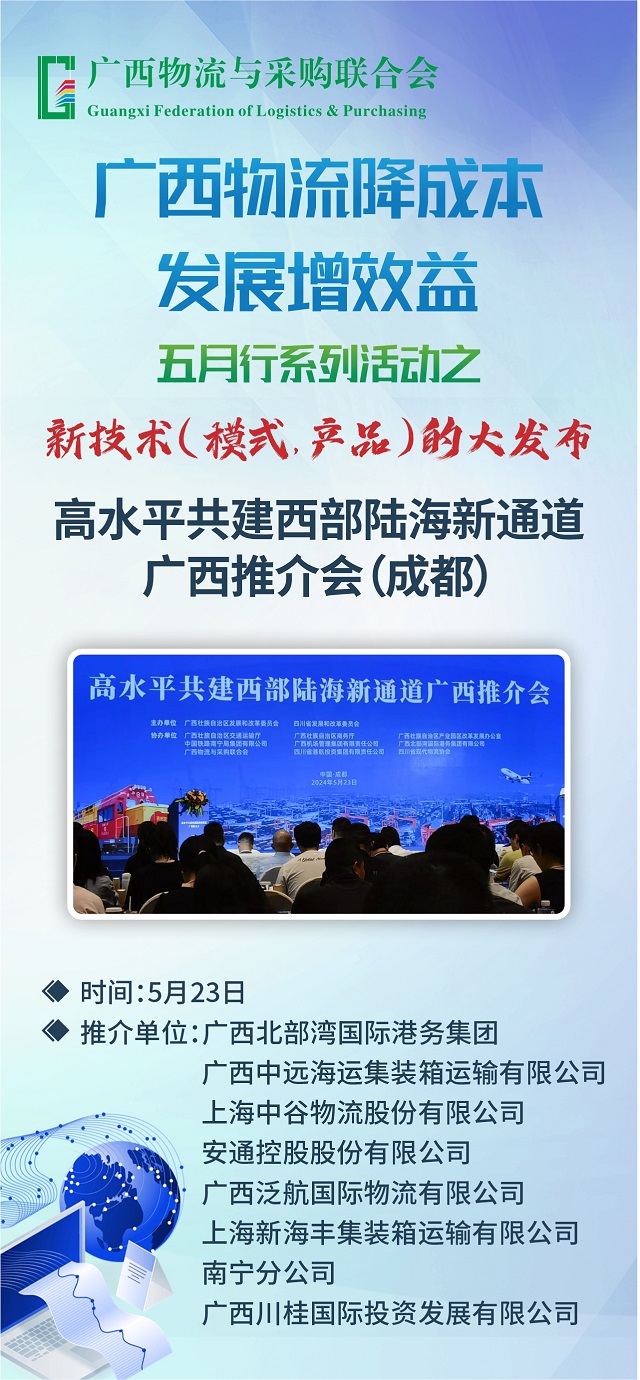 5月23日,为深化川桂两省区务实合作,共享西部陆海新通道发展机遇,由广西壮族自治区发展和改革委员会、四川省发展和改革委员会共同主办的高水平共建西部陆海新通道广西推介会在成都成功举行。本次会议由广西物流与采购联合会协办,来自四川、广西两省区的相关部门、有关企业和行业协会代表等200余人参加会议。