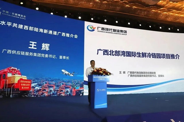 广西现代物流集团总经理刘鑫出席会议,广西供应链服务集团董事长王辉作广西北部湾国际生鲜冷链园区推介发言。