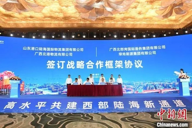推介会现场,发布了西部陆海新通道北部湾国际门户港重大项目建设成果,绿地能源集团有限公司与广西北部湾国际港务集团有限公司、山东港口陆海国际物流集团有限公司与广西北港物流有限公司分别签订了战略合作框架协议。