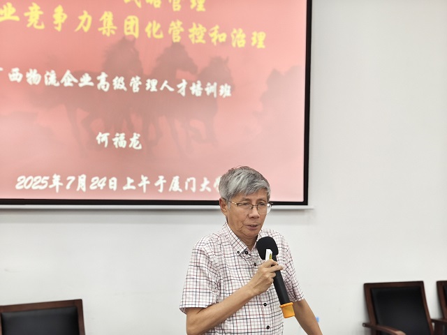 本次培训采取课堂理论和现场教学相结合的形式,内容丰富且具有针对性,多位知名专家学者带来了前沿洞见与实践经验。庄国土教授深入剖析“一带一路”和西部陆海新通道背景下广西面临的机遇与挑战,提出借力国家发展战略定位,打造跨境供应链枢纽的战略方向;供应链管理专家秦涛通过先进企业供应链优化案例,梳理广西国际供应链结构,深入分析发展中的痛点与机遇;林风元教授从产业链招商视角,解读“厦门现代物流园区现状与发展战略”,为广西物流布局优化和枢纽效能提升提供启发;何福龙教授探讨国有企业集团化管控的难点与对策,为企业治理带来新思路;张德富教授以DeepSeek等AI技术在库存预测、物流调度中的应用为例,展现智能算法的颠覆性作用,为物流行业数智化转型打开新视野;王龙雏教授分享象屿集团立足供应链、服务产业链的实践案例,引发学员对企业业务转型的深度思考。