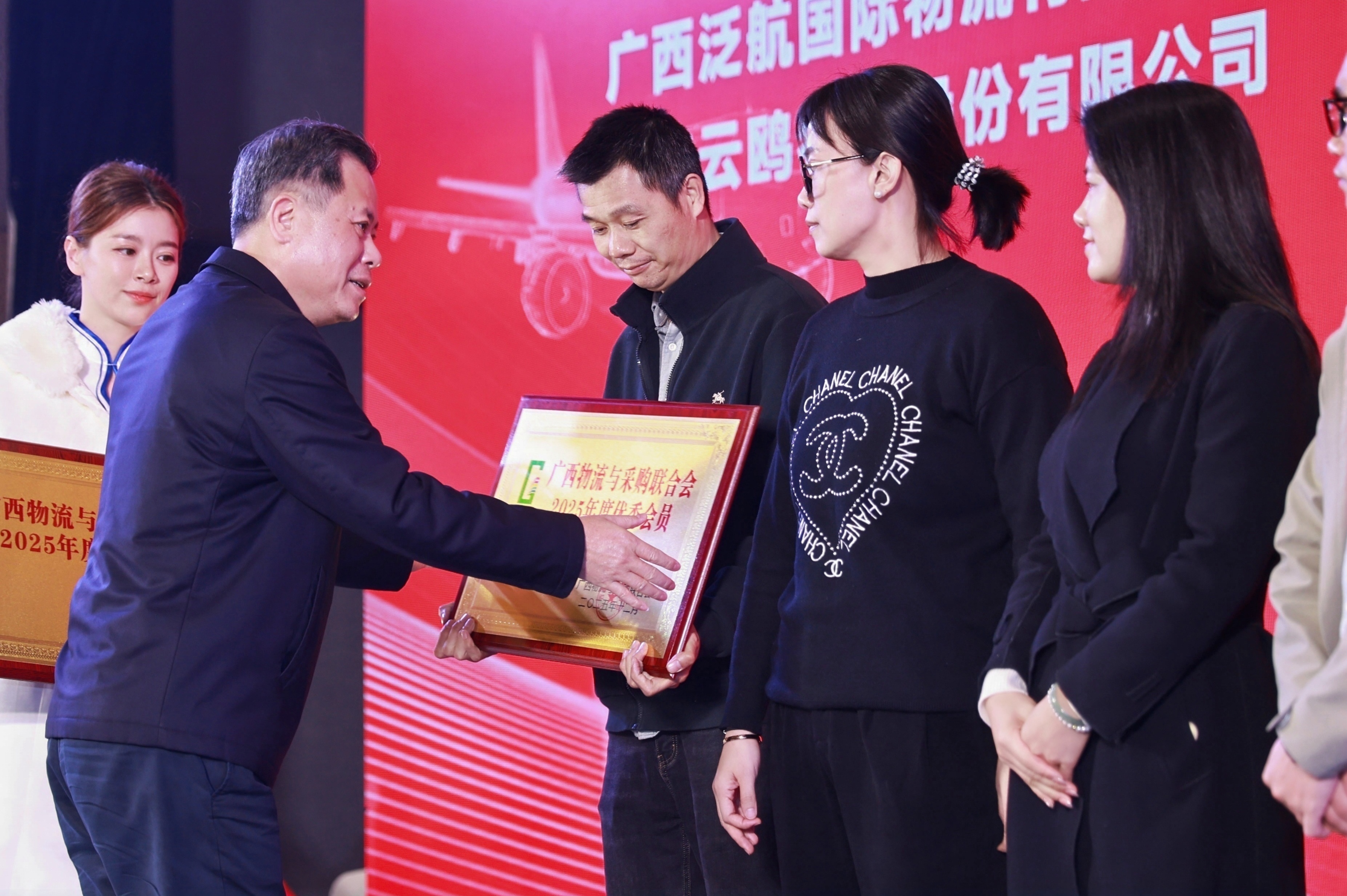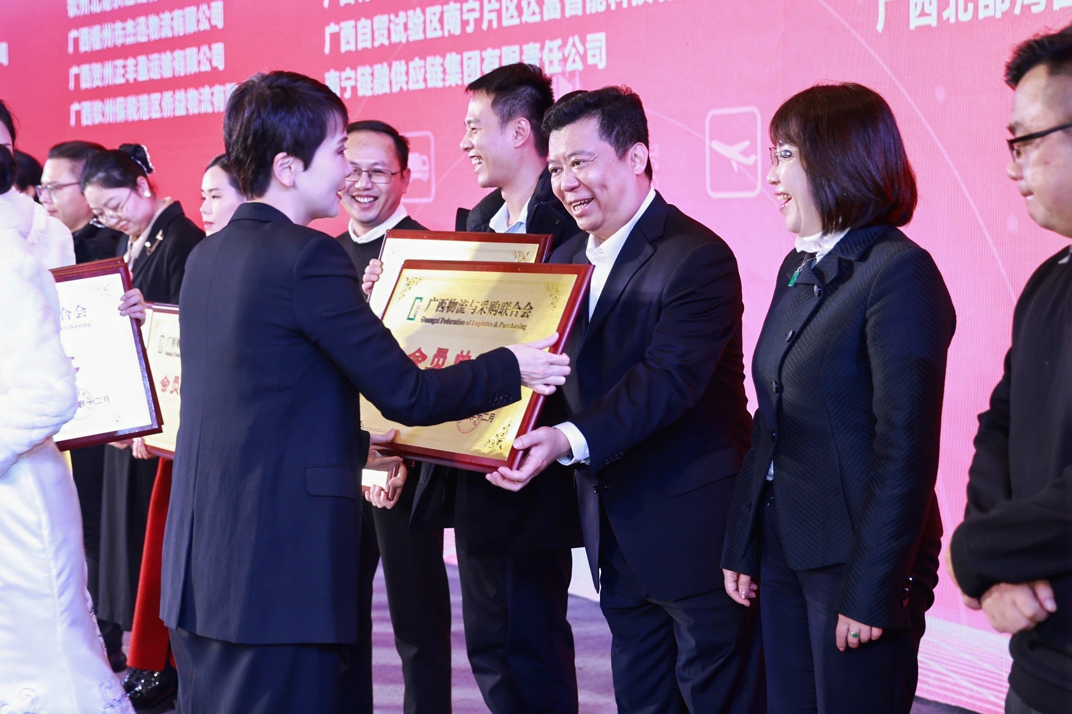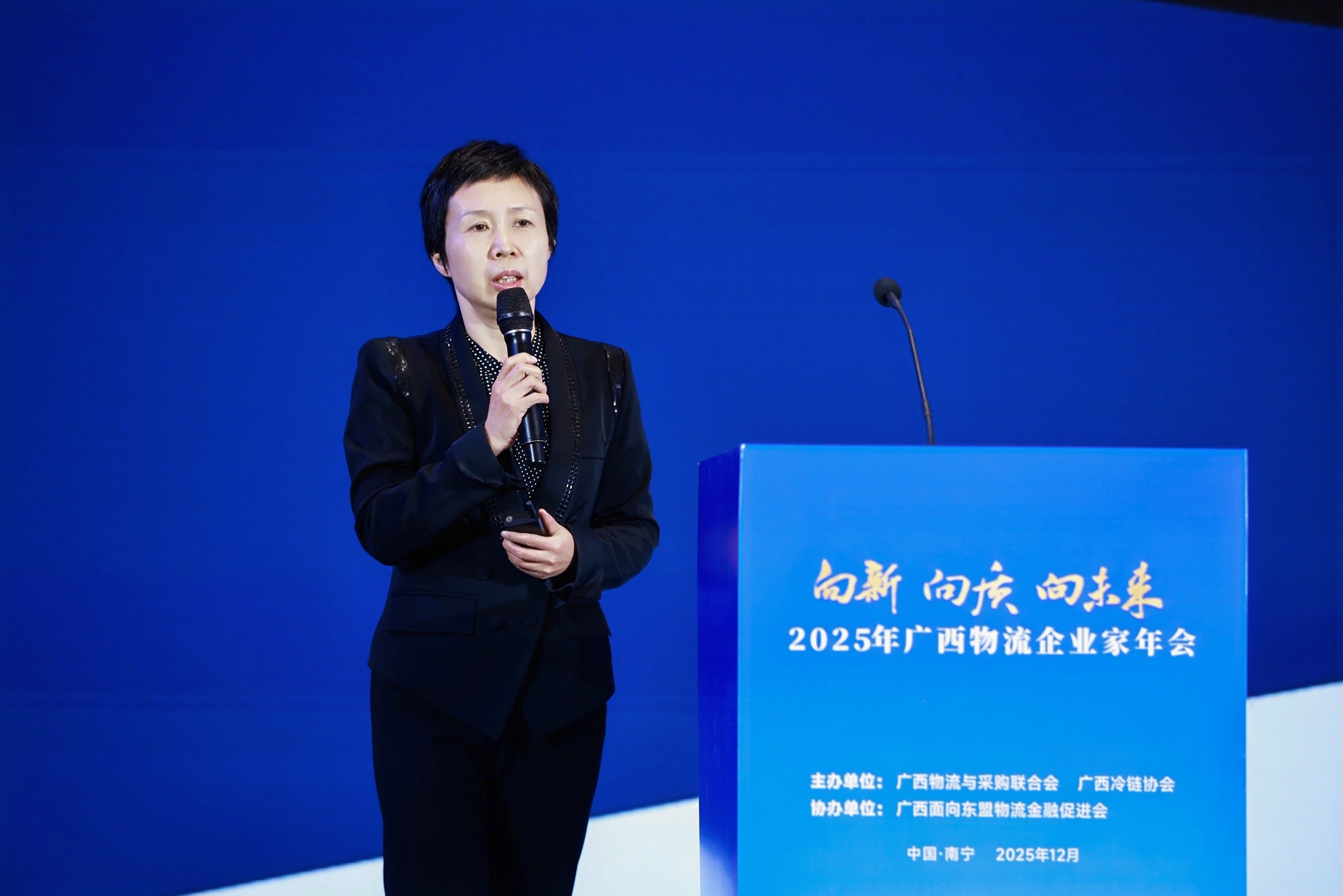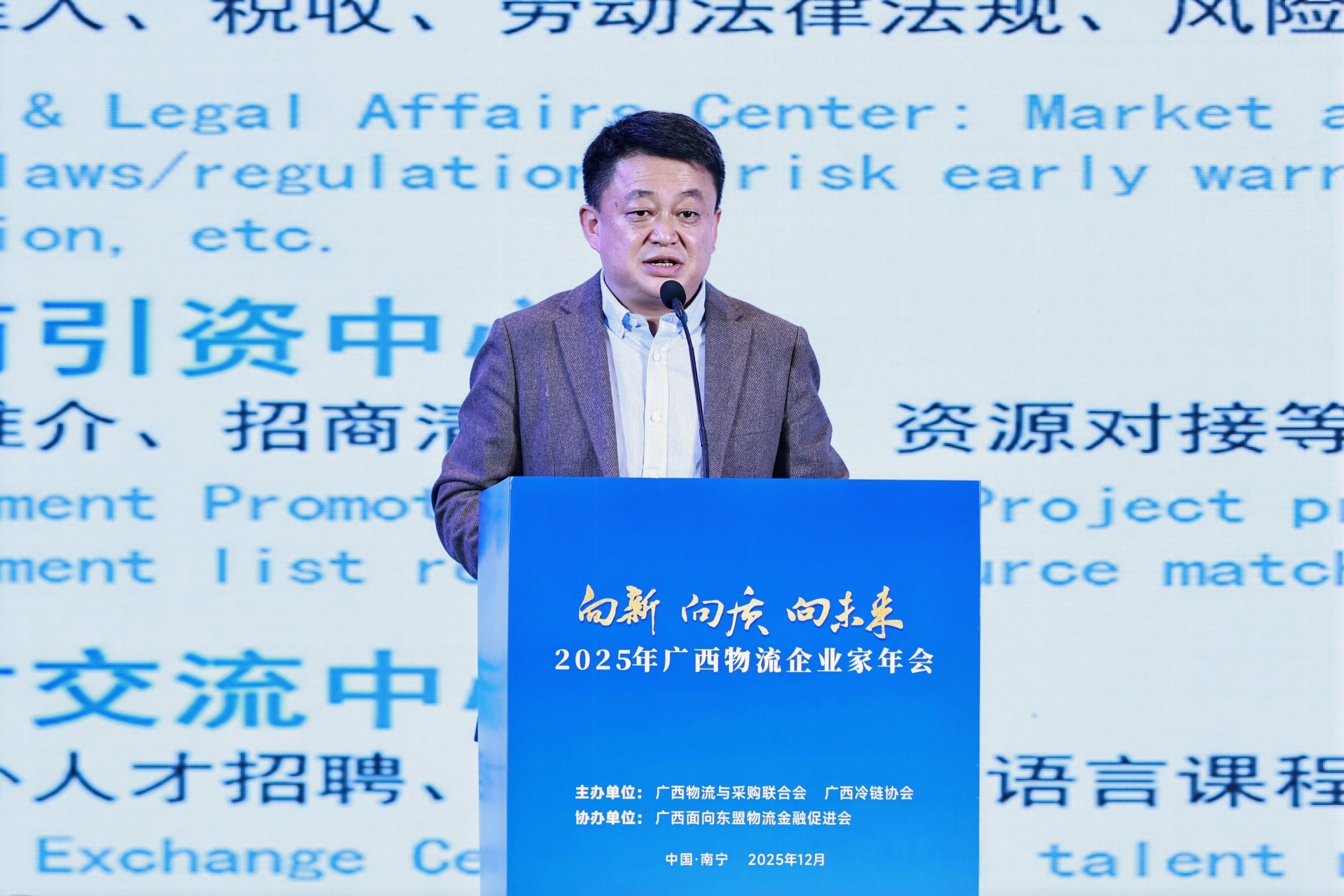 自治区党委社会工作部副部长孙红,中国物流与采购联合会冷链委秘书长秦玉鸣,广西现代物流集团党委书记、董事长覃黎魁,党委副书记、副董事长、总经理冯小金,党委委员、副总经理、广西物流与采购联合会会长罗圆出席大会。自治区发展改革委经贸处处长陈小龙、自治区交通运输厅运输处副处长庞雪莲、自治区产业园区办港航物流处二级调研员林丹枫、自治区道路运输发展中心副主任刘善赞、自治区党委社会工作部二处四级调研员陈鹏州,以及南宁市发展改革委、交通运输局、五象新区管委会商务和贸易发展局,桂林市发展改革委,防城港市产业园区办,中马钦州产业园区管委贸易和物流发展局等地市行业主管部门代表,广西物流与采购联合会、广西冷链协会、广西面向东盟物流金融促进会会员单位代表,地市物流行业协会代表,中国物流与采购联合会冷链委、中国物流与采购联合会数字化仓储分会、广西福建总商会、广西汽车物流运输行业协会、广西国际货物运输代理协会、广西东盟法商促进会、广西农副食品贸易联合会、广西农业产业商会、广西新桂桂商商会、广西大健康和文旅产业促进会、广西环境保护研究学会等相关协会负责人,区内重点物流、供应链、商贸、制造业企业,各行业相关事业单位、金融机构、科研机构、高校院所代表及新闻媒体超220多家单位代表参加了大会。大会由广西物流与采购联合会副会长、广西冷链协会会长张华主持。陈小龙在致辞中表示,“十四五”期间,广西紧抓国家战略机遇,积极构建“枢纽+通道+网络”的现代物流运行体系,全区社会物流总费用与GDP比率从2020年的14.8%降至2024年的13.8%,连续四年低于全国平均水平。市场主体结构不断优化,A级物流企业数量增至204家,专业服务能力显著增强。7个国家物流枢纽和4个国家骨干冷链物流基地列入国家建设名单,基础设施布局加速完善。他提出三点展望建议:一是紧扣“向新”引领,以智慧物流赋能产业升级。积极抢抓“人工智能+”行动机遇,推动大数据、物联网、区块链等新一代信息技术在物流全链条、各环节的深度应用。二是坚持“向质”提升,以枢纽经济带动区域协同。以枢纽为核心,形成一批服务高端制造、大宗商品贸易等专业性、特色鲜明的物流供应链服务企业,形成“以枢纽聚产业、以产业强枢纽”的良性循环。三是携手“向未来”,以开放合作拓展发展空间。加快打造国内国际双循环市场经营便利地。以面向东盟、共建“一带一路”为重点,扩大开放合作,实现海陆统筹、内外联动,更好服务新发展格局。广西现代物流集团党委书记、董事长覃黎魁为企业授牌