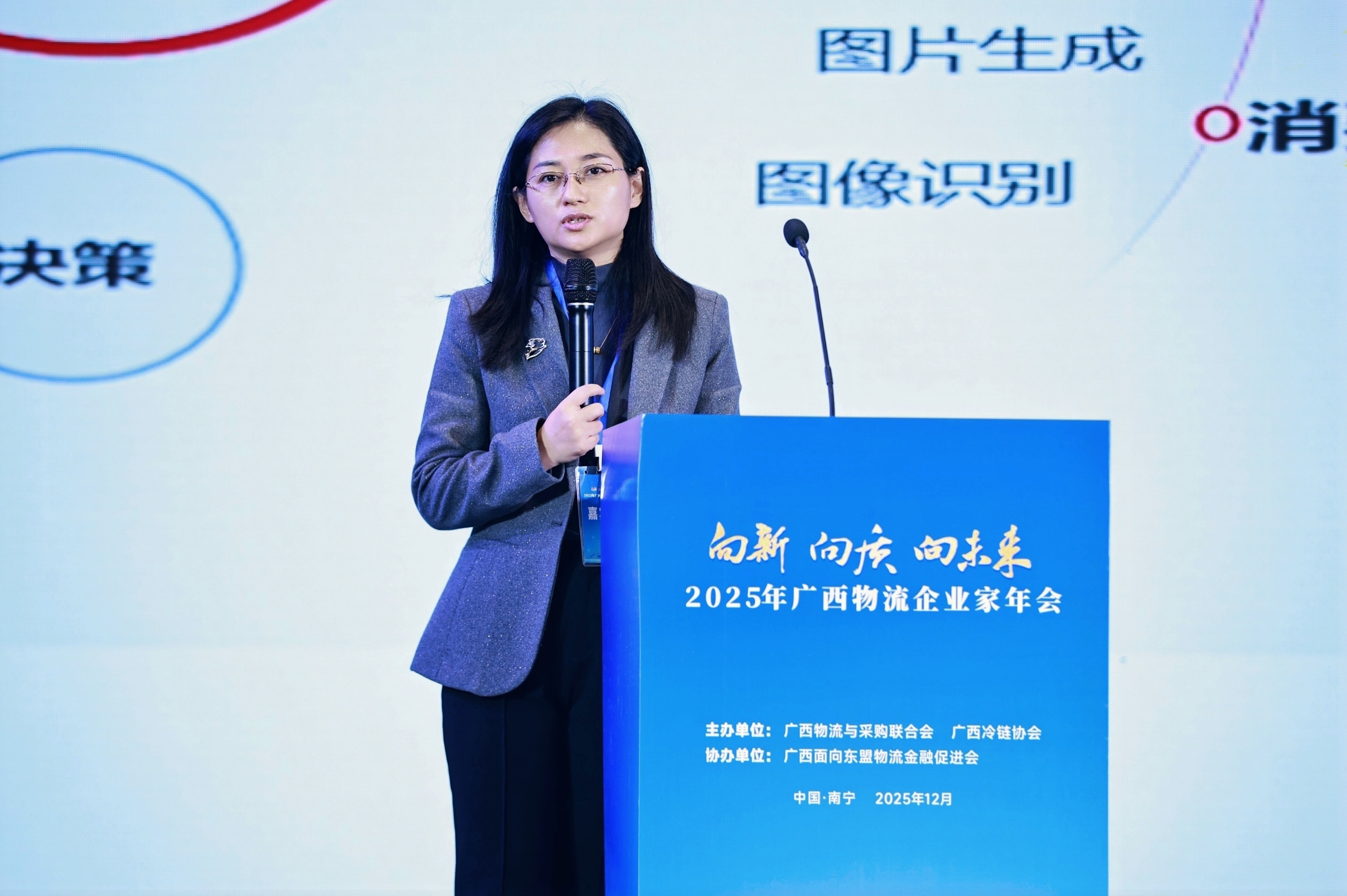 冯小金在致辞中介绍了广西现代物流集团聚焦主责主业、服务广西物流高质量发展的实践和经验。他表示,站在“十四五”与“十五五”承前启后的历史节点,面对机遇与挑战并存的新局面,提出四点倡议:一是共同推进“枢纽经济”融合发展。加强区内国家物流枢纽、骨干冷链基地及相关产业之间的业务协同与信息互联,推动物流设施与工业园区、商贸市场深度融合,切实将区位优势转化为经济优势。二是共同加快“人工智能+”落地应用。推进智能调度、无人驾驶、数字孪生仓库等场景的规模化应用,合作研发适用广西及东盟特色的物流行业模型。三是共同践行“绿色物流”低碳转型。共同推广新能源及清洁能源运输装备,探索绿色包装循环共用体系,发展共同配送等集约化模式;积极参与行业碳足迹标准制定与核算工作,引领产业链实现绿色低碳转型。四是共同构建“面向东盟”的物流体系。打造“端到端”的跨境供应链服务能力。积极对接RCEP等规则,推动通关便利化、单证标准化,携手提升中国—东盟国际物流走廊的整体效率与可靠性。主题演讲环节精彩纷呈。自治区人民政府发展研究中心区域经济研究处处长李世泽以《中国—东盟自贸区3.0版激发广西物流开放发展新动能》为题,介绍了自贸区3.0版以规则、数字、绿色、产链和韧性为核心的五大新动能。成都市供应链协会常务副会长兼秘书长王智超以《“一带一路”供应链服务站模式分享》为题,分享了“供应链服务站”模式构建稳定、高效的跨境物流网络的实践内容。华为技术有限公司物流与仓储军团首席专家刘颖以《释放数据和AI价值,助力物流行业高质量发展》为题,研讨物流行业智能化发展趋势及企业在各类AI应用场景下业如何建好AI、用好AI并发挥AI价值。万联易达集团广西公司总经理朱静以《物流数智化转型新机遇》为题,介绍了企业运营视角的物流数智化转型核心。广西桂物物流服务集团有限公司副总经理郭胜以《桂物物流在创新物流服务模式的发展实践》为题,介绍了国有企业如何通过模式创新和服务升级在新时代担当作为、引领发展。广西泛航国际物流有限公司董事长贺忠以《新形势下,民营物流企业的发展思考》为题,分享了在当前国际形势与高质量发展的要求下民营物流的发展之道。中国物流与采购联合会数字化仓储分会秘书长助理张宁以《数字化仓库建设助力国家物流枢纽经济区高质量发展》为题,分享了物流仓储行业特点及数字化仓库、电子仓单的标准和相关解决方案。中国物流与采购联合会冷链委秘书长秦玉鸣以《2025冷链高质量发展新洞察》为题,分享了冷链产业发展的新背景、新需求、新服务、新趋势,分析了冷链物流发展新方向。