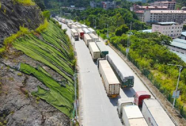 2023年5月29日,满载745吨越南鲜榴莲的大型货车,一辆辆整齐列队经友谊关口岸浦寨通道入境,这是浦寨通道今年以来单日榴莲进口的高峰。