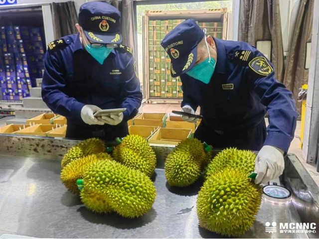 2022年以来,越南榴莲获准进入中国,榴莲供给增加,进货渠道也日益多样化。该批鲜榴莲将会在凭祥物流园卸货,分发运往全国各地。由于鲜榴莲保质期较短,对通关物流时效性要求高,接到企业对生鲜蔬果的申报后,友谊关边检站立即启动专项勤务保障机制,协同友谊关海关等部门及时开通“跨境果蔬专用通道”,为该批鲜榴莲快速办理出入境边防检查手续,确保通关零等待、零延时。
