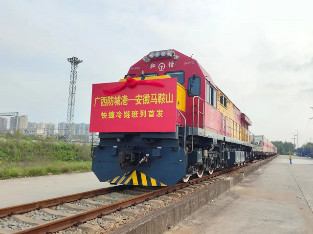 2023年5月6日上午,广西防城港至安徽马鞍山的快捷冷链班列首次发车。搭载8个冷链集装箱将经马鞍山市分拨至周边的生鲜市场,让当地百姓可以品尝到来自北部湾的海鲜产品。至此,广西防城港开行的冷链班列线路升至9条。