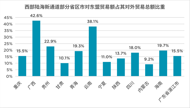 在西部陆海新通道的“13+2”省区市中,重庆、广西、四川、云南、陕西、海南、贵州、内蒙古、甘肃、广东湛江市等10省区市与东盟的贸易量较大。2022年,上述10省区市与东盟贸易额占中国对东盟贸易总量的13.4%;其中广西、云南、贵州、海南、青海5省区市与东盟的贸易额占本省区市全年对外贸易额的比重较高,分别为42.6%、38.1%、22.9%、19.7%、19.3%。
