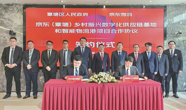 3月31日,京东(覃塘)乡村振兴数字化供应链基地和智能物流港项目合作协议签约仪式在北京举行。广西贵港市覃塘区委书记韦安宁,京东物流副总裁、物流科技总经理程岩出席仪式并见证签约。覃塘区副区长覃桂新,覃塘区城投集团党委书记、 董事长滕勇,京东物流集团、政企业务部拓展负责人李竹轩分别代表双方进行签约。此次合作,京东物流将与覃塘区携手共建乡村振兴数字化供应链基地和智能物流港,依托京东物流一体化供应链和数字化技术优势,在构建现代智能物流体系、打造农产品区域公用品牌、推动产教深度融合等方面,开展多层次、重创新、实质性的全方位合作,带动当地农特产业链上下游协同发展,降低综合物流成本,打造全国乡村振兴示范标杆。