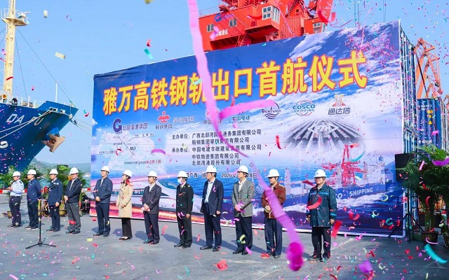 2020年11月28日上午10时08分,伴随着洪亮的轮船鸣笛,现场礼花冲天,在北部湾港防城港6号泊位“大富”轮两台船用克令吊同时启动,7根50米长钢轨缓缓起吊,平稳地铺放在船舱预定货位上,这是印尼雅万高铁钢轨第一码货物装船,也是中国高铁“整体出口”的第一单。对于发挥北部湾国际门户港的作用,服务“一带一路”,有着重要作用。